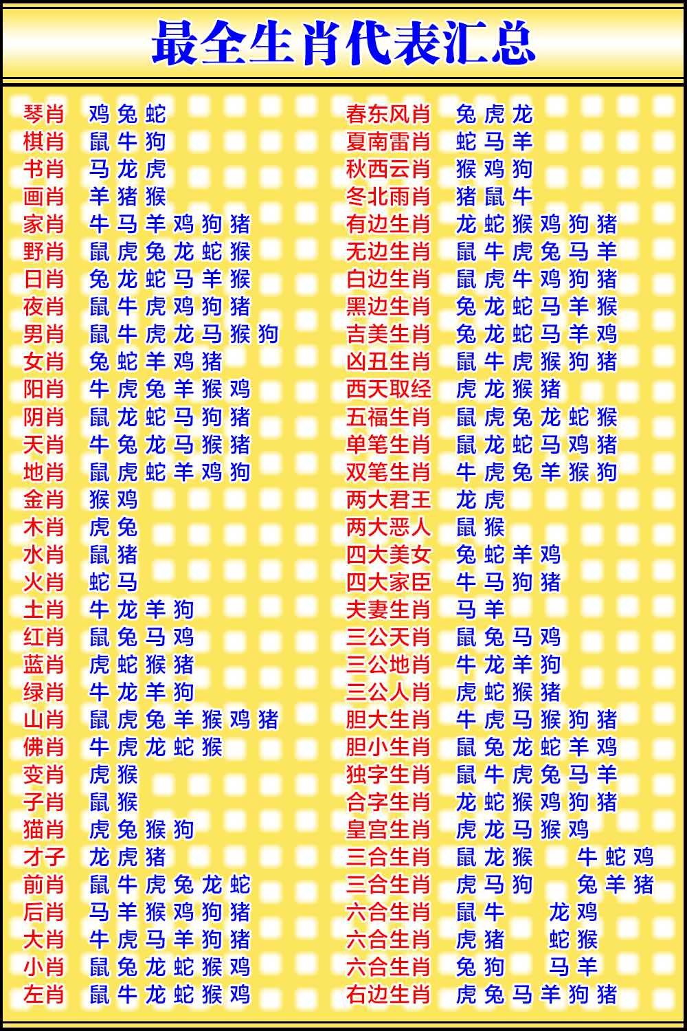 | 前肖:鼠牛虎兔龙蛇 后肖:马羊猴鸡狗猪 |